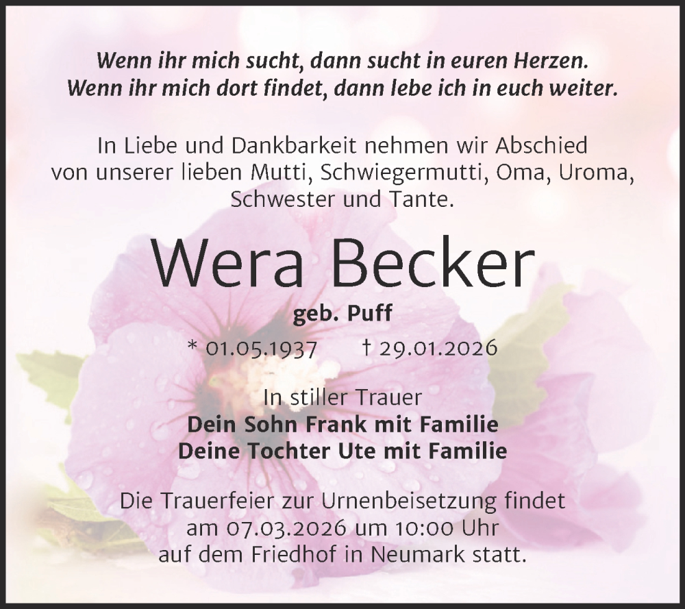 Hier finden Sie alle Traueranzeigen aus der Zeitung, die bisher für Wera Becker erschienen sind. Weitere Traueranzeigen, die in der Zeitung erscheinen, werden hier ebenfalls aufgelistet