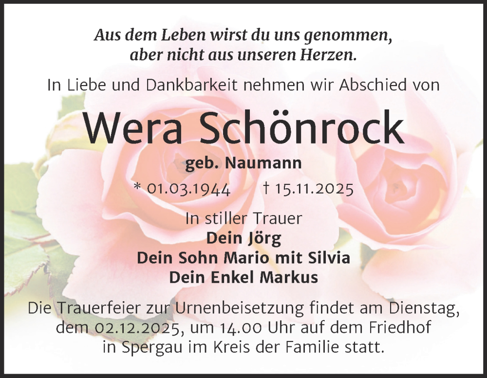 Hier finden Sie alle Traueranzeigen aus der Zeitung, die bisher für Wera Schönrock erschienen sind. Weitere Traueranzeigen, die in der Zeitung erscheinen, werden hier ebenfalls aufgelistet