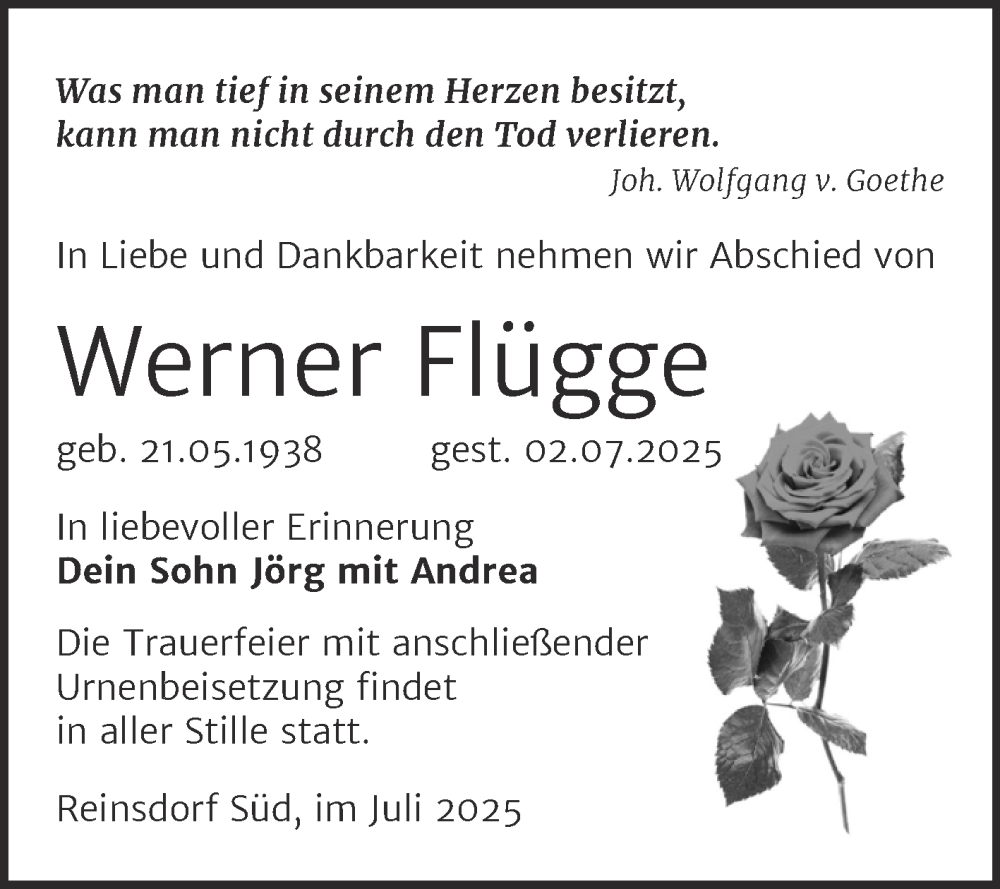 Hier finden Sie alle Traueranzeigen aus der Zeitung, die bisher für Werner Flügge erschienen sind. Weitere Traueranzeigen, die in der Zeitung erscheinen, werden hier ebenfalls aufgelistet