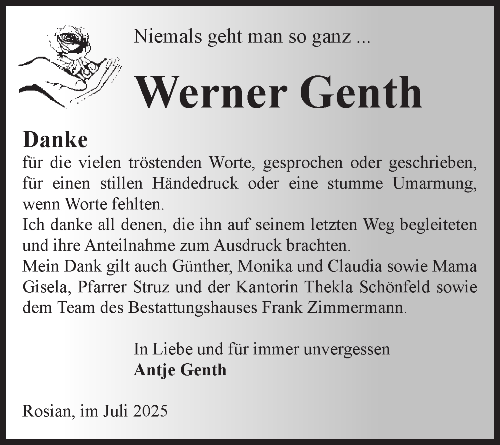 Hier finden Sie alle Traueranzeigen aus der Zeitung, die bisher für Werner Genth erschienen sind. Weitere Traueranzeigen, die in der Zeitung erscheinen, werden hier ebenfalls aufgelistet