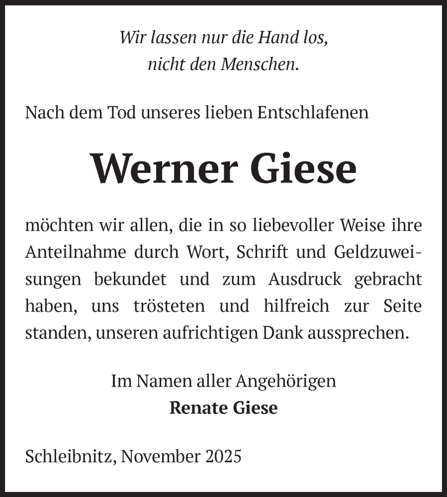 Hier finden Sie alle Traueranzeigen aus der Zeitung, die bisher für Werner Giese erschienen sind. Weitere Traueranzeigen, die in der Zeitung erscheinen, werden hier ebenfalls aufgelistet