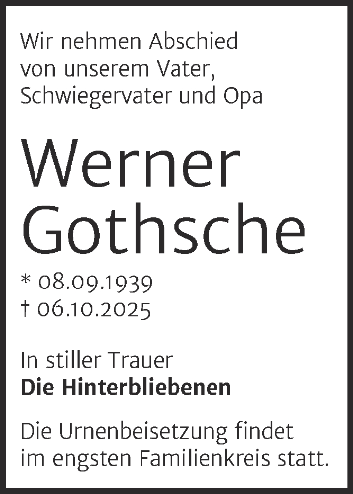 Hier finden Sie alle Traueranzeigen aus der Zeitung, die bisher für Werner Gothsche erschienen sind. Weitere Traueranzeigen, die in der Zeitung erscheinen, werden hier ebenfalls aufgelistet