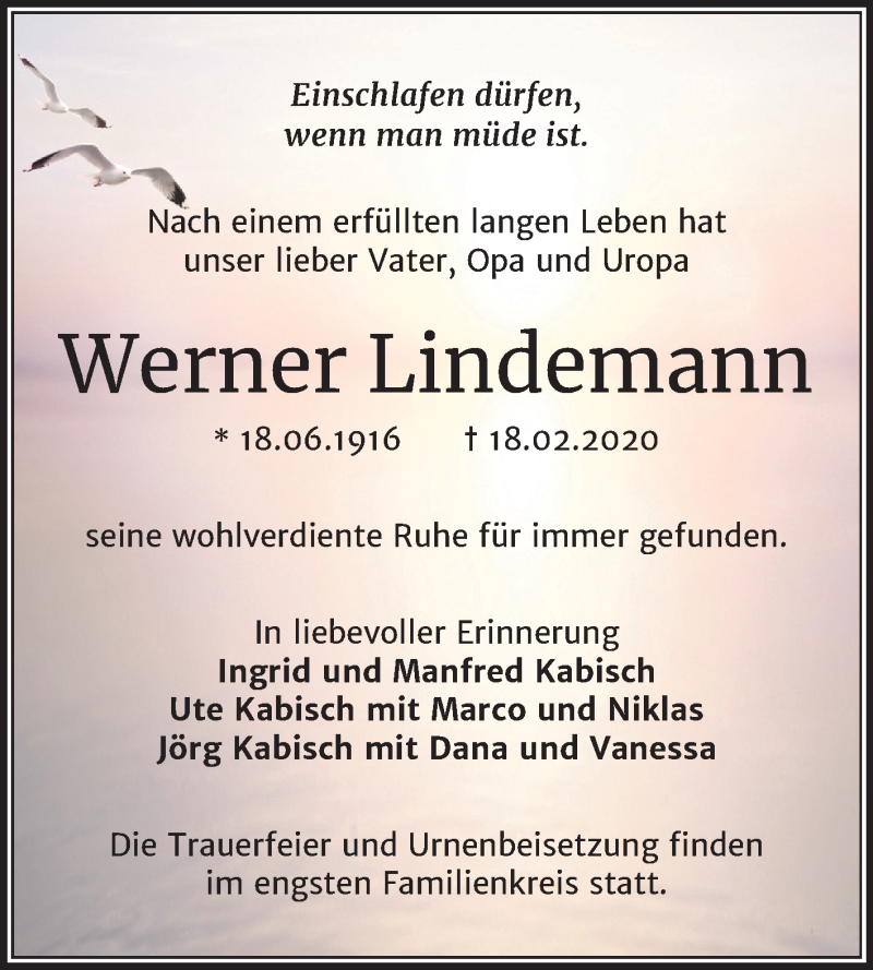 Hier finden Sie alle Traueranzeigen aus der Zeitung, die bisher für Werner Lindemann erschienen sind. Weitere Traueranzeigen, die in der Zeitung erscheinen, werden hier ebenfalls aufgelistet