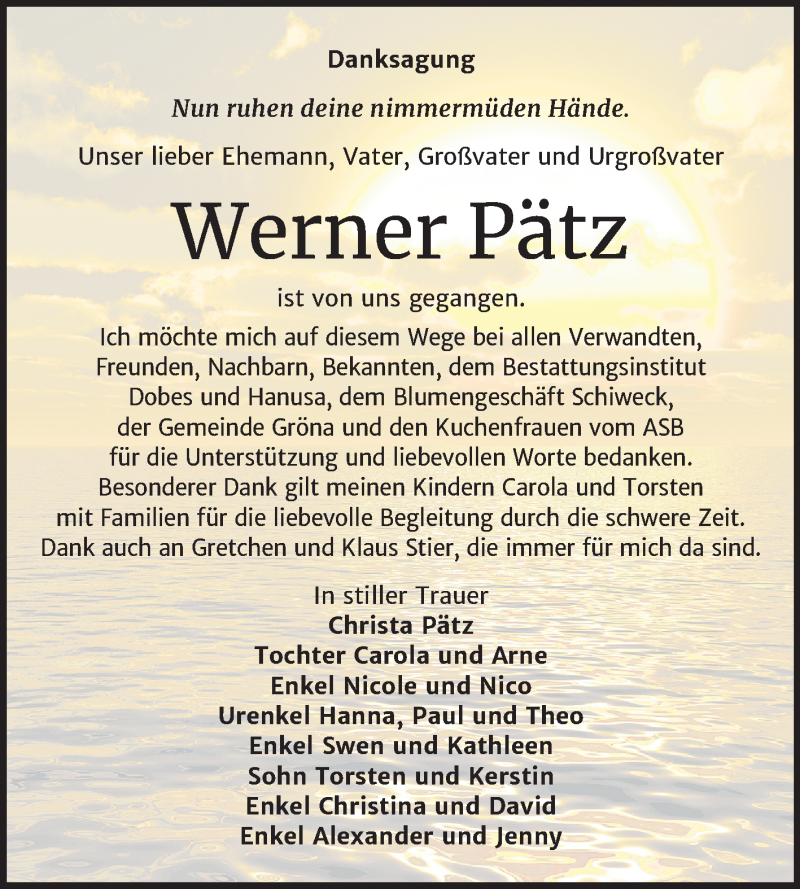 Hier finden Sie alle Traueranzeigen aus der Zeitung, die bisher für Werner Pätz erschienen sind. Weitere Traueranzeigen, die in der Zeitung erscheinen, werden hier ebenfalls aufgelistet