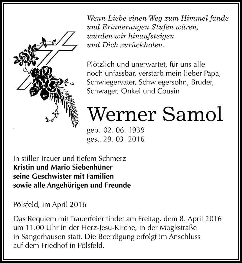 Hier finden Sie alle Traueranzeigen aus der Zeitung, die bisher für Werner Samol erschienen sind. Weitere Traueranzeigen, die in der Zeitung erscheinen, werden hier ebenfalls aufgelistet