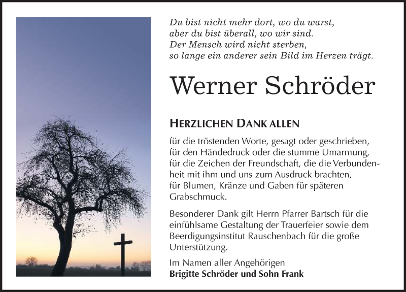 Hier finden Sie alle Traueranzeigen aus der Zeitung, die bisher für Werner Schröder erschienen sind. Weitere Traueranzeigen, die in der Zeitung erscheinen, werden hier ebenfalls aufgelistet