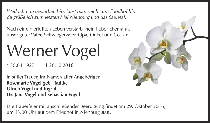 Hier finden Sie alle Traueranzeigen aus der Zeitung, die bisher für Werner Vogel erschienen sind. Weitere Traueranzeigen, die in der Zeitung erscheinen, werden hier ebenfalls aufgelistet