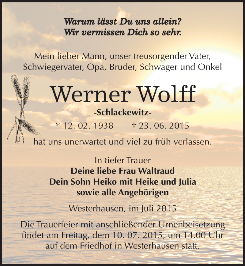 Hier finden Sie alle Traueranzeigen aus der Zeitung, die bisher für Werner Wolff erschienen sind. Weitere Traueranzeigen, die in der Zeitung erscheinen, werden hier ebenfalls aufgelistet