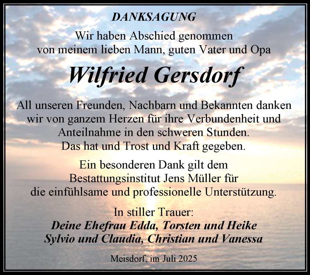 Hier finden Sie alle Traueranzeigen aus der Zeitung, die bisher für Wilfried Gersdorf erschienen sind. Weitere Traueranzeigen, die in der Zeitung erscheinen, werden hier ebenfalls aufgelistet
