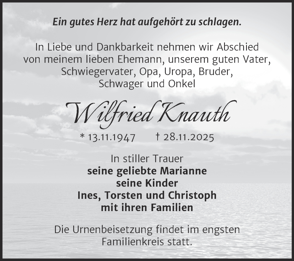Hier finden Sie alle Traueranzeigen aus der Zeitung, die bisher für Wilfried Knauth erschienen sind. Weitere Traueranzeigen, die in der Zeitung erscheinen, werden hier ebenfalls aufgelistet