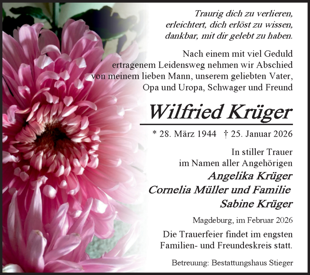 Hier finden Sie alle Traueranzeigen aus der Zeitung, die bisher für Wilfried Krüger erschienen sind. Weitere Traueranzeigen, die in der Zeitung erscheinen, werden hier ebenfalls aufgelistet