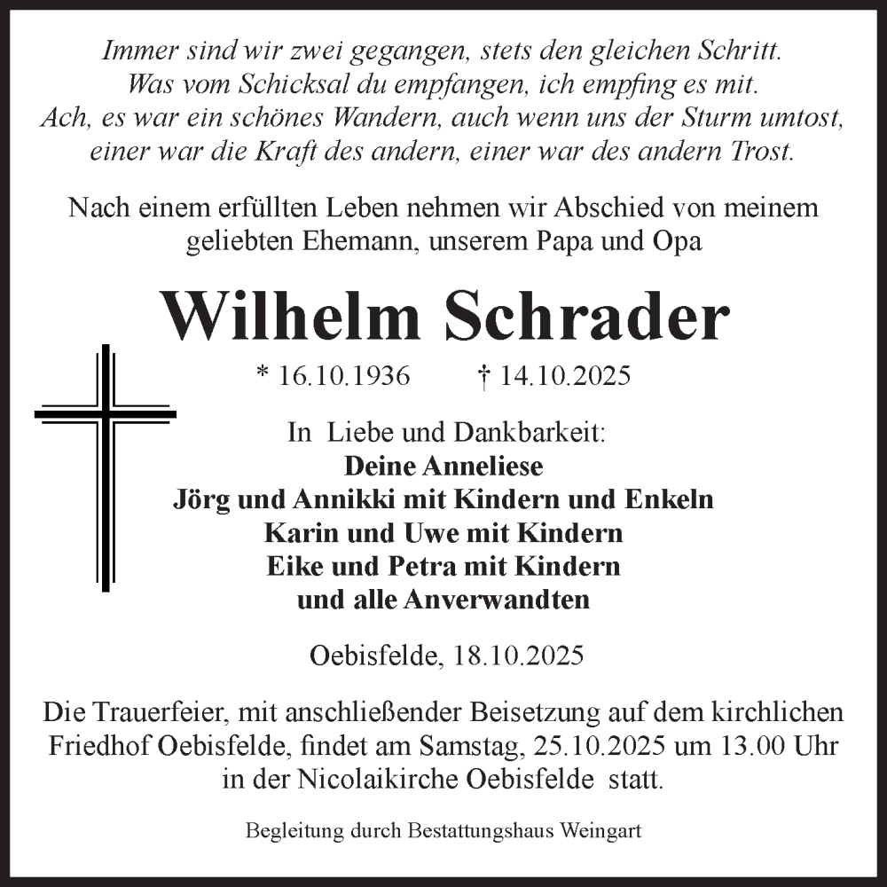 Hier finden Sie alle Traueranzeigen aus der Zeitung, die bisher für Wilhelm Schrader erschienen sind. Weitere Traueranzeigen, die in der Zeitung erscheinen, werden hier ebenfalls aufgelistet