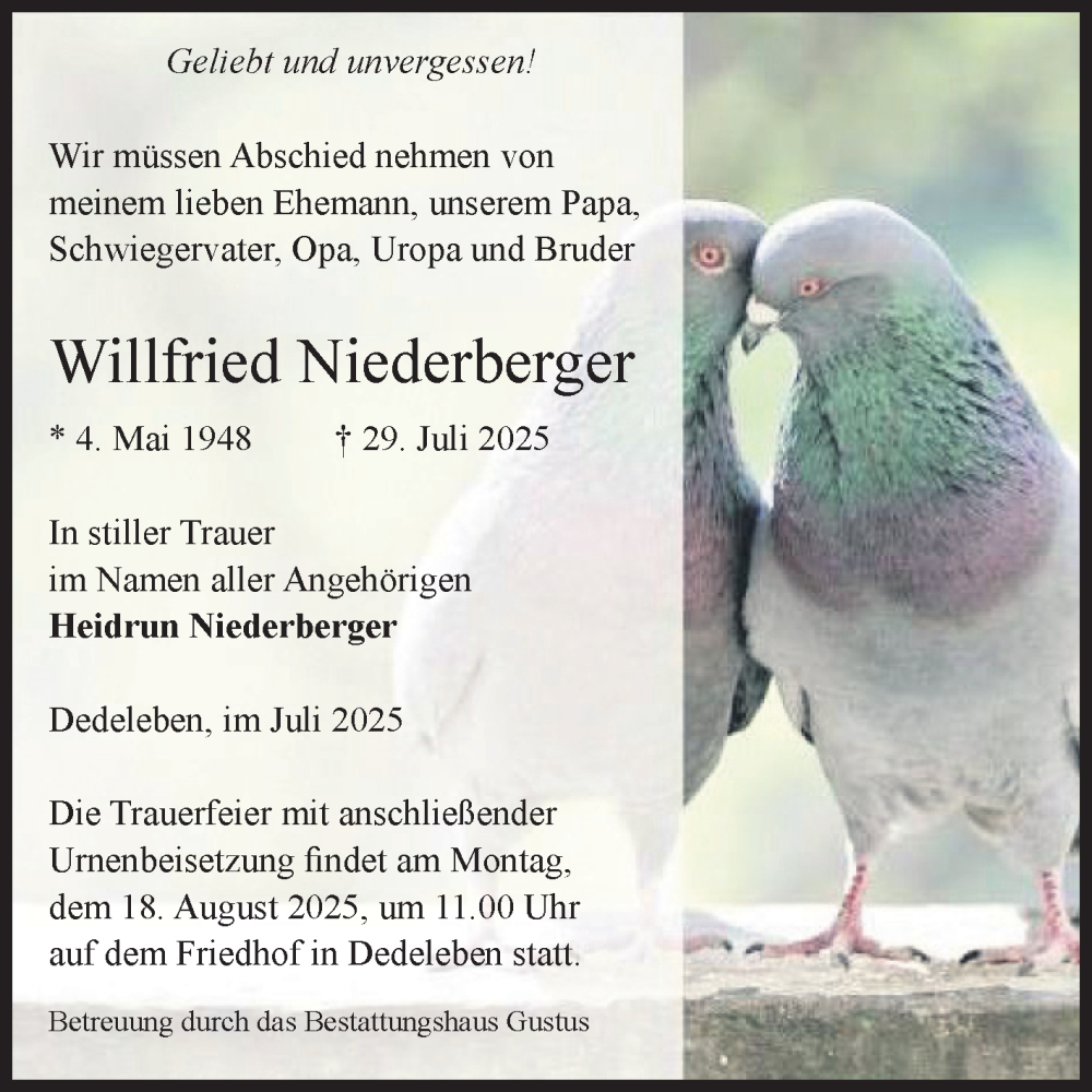 Hier finden Sie alle Traueranzeigen aus der Zeitung, die bisher für Willfried Niederberger erschienen sind. Weitere Traueranzeigen, die in der Zeitung erscheinen, werden hier ebenfalls aufgelistet