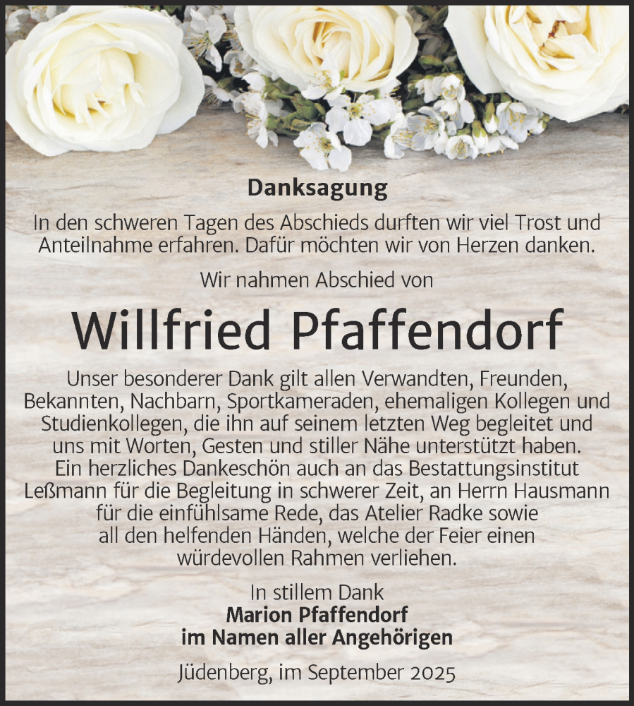 Hier finden Sie alle Traueranzeigen aus der Zeitung, die bisher für Willfried Pfaffendorf erschienen sind. Weitere Traueranzeigen, die in der Zeitung erscheinen, werden hier ebenfalls aufgelistet