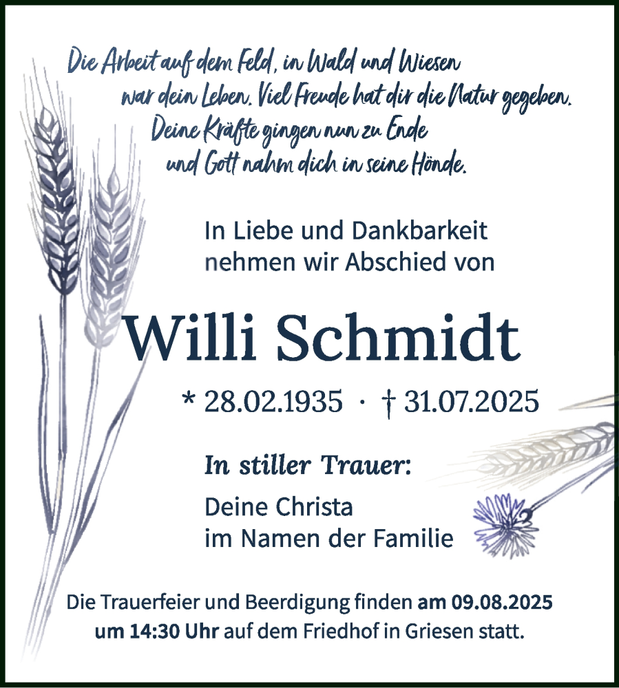 Hier finden Sie alle Traueranzeigen aus der Zeitung, die bisher für Willi Schmidt erschienen sind. Weitere Traueranzeigen, die in der Zeitung erscheinen, werden hier ebenfalls aufgelistet
