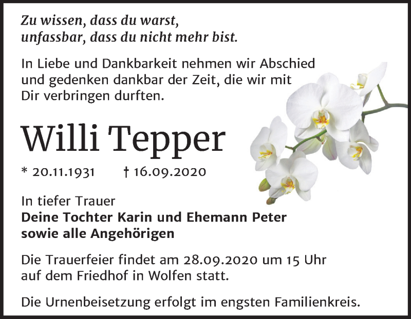Hier finden Sie alle Traueranzeigen aus der Zeitung, die bisher für Willi Tepper erschienen sind. Weitere Traueranzeigen, die in der Zeitung erscheinen, werden hier ebenfalls aufgelistet
