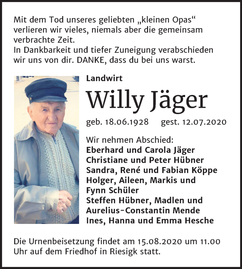 Hier finden Sie alle Traueranzeigen aus der Zeitung, die bisher für Willy Jäger erschienen sind. Weitere Traueranzeigen, die in der Zeitung erscheinen, werden hier ebenfalls aufgelistet