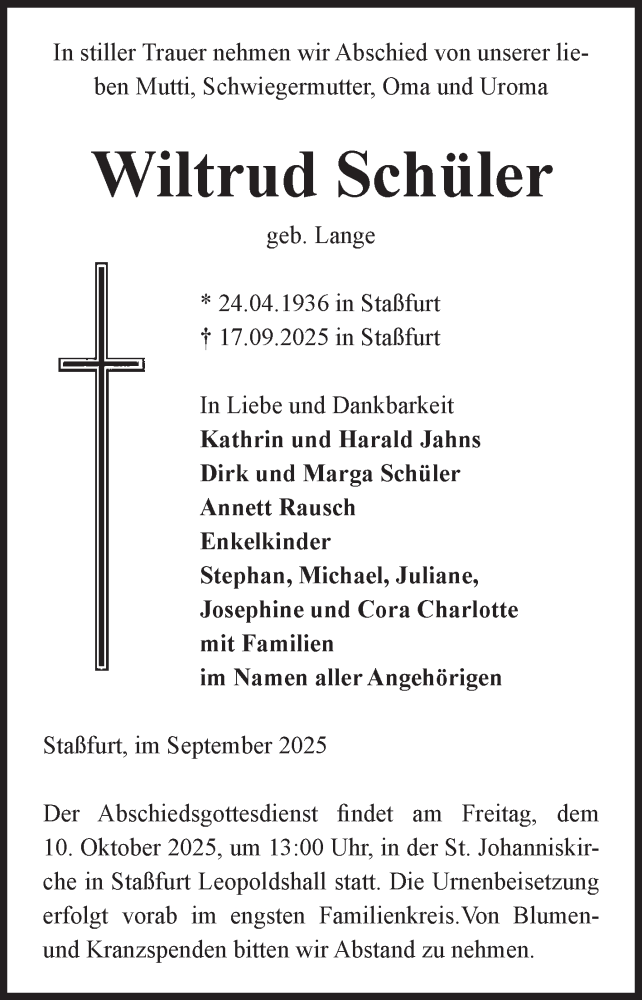 Hier finden Sie alle Traueranzeigen aus der Zeitung, die bisher für Wiltrud Schüler erschienen sind. Weitere Traueranzeigen, die in der Zeitung erscheinen, werden hier ebenfalls aufgelistet