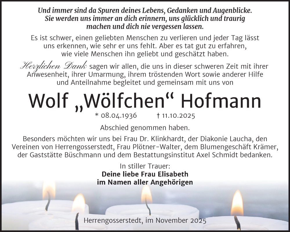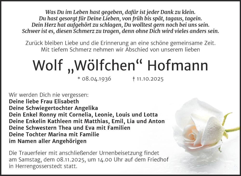 Hier finden Sie alle Traueranzeigen aus der Zeitung, die bisher für Wolf Hofmann erschienen sind. Weitere Traueranzeigen, die in der Zeitung erscheinen, werden hier ebenfalls aufgelistet