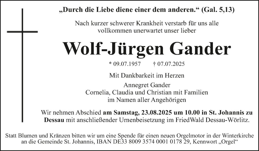 Hier finden Sie alle Traueranzeigen aus der Zeitung, die bisher für Wolf-Jürgen Gander erschienen sind. Weitere Traueranzeigen, die in der Zeitung erscheinen, werden hier ebenfalls aufgelistet