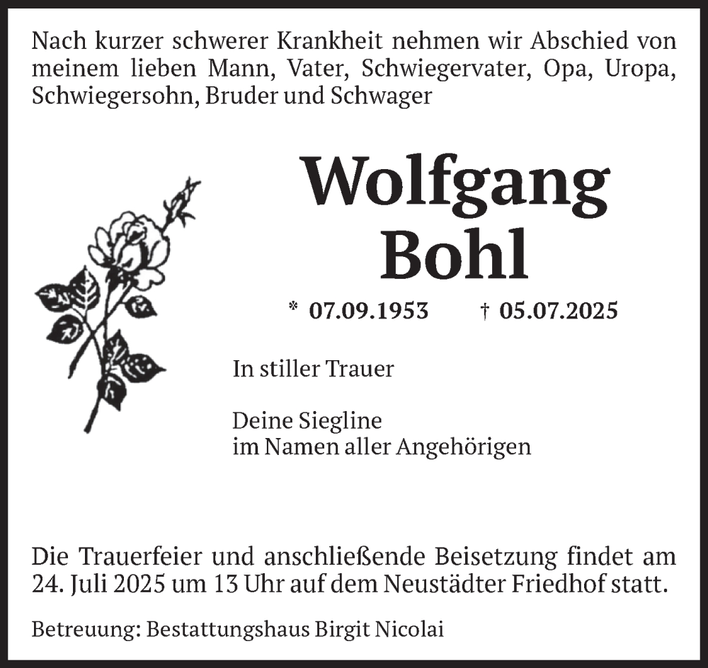 Hier finden Sie alle Traueranzeigen aus der Zeitung, die bisher für Wolfgang Bohl erschienen sind. Weitere Traueranzeigen, die in der Zeitung erscheinen, werden hier ebenfalls aufgelistet
