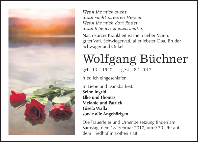 Hier finden Sie alle Traueranzeigen aus der Zeitung, die bisher für Wolfgang Büchner erschienen sind. Weitere Traueranzeigen, die in der Zeitung erscheinen, werden hier ebenfalls aufgelistet