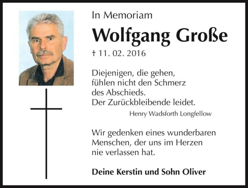 Hier finden Sie alle Traueranzeigen aus der Zeitung, die bisher für Wolfgang Große erschienen sind. Weitere Traueranzeigen, die in der Zeitung erscheinen, werden hier ebenfalls aufgelistet