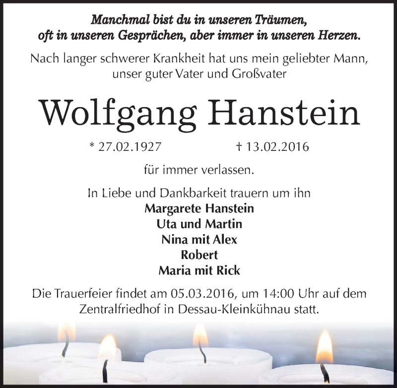 Hier finden Sie alle Traueranzeigen aus der Zeitung, die bisher für Wolfgang Hanstein erschienen sind. Weitere Traueranzeigen, die in der Zeitung erscheinen, werden hier ebenfalls aufgelistet
