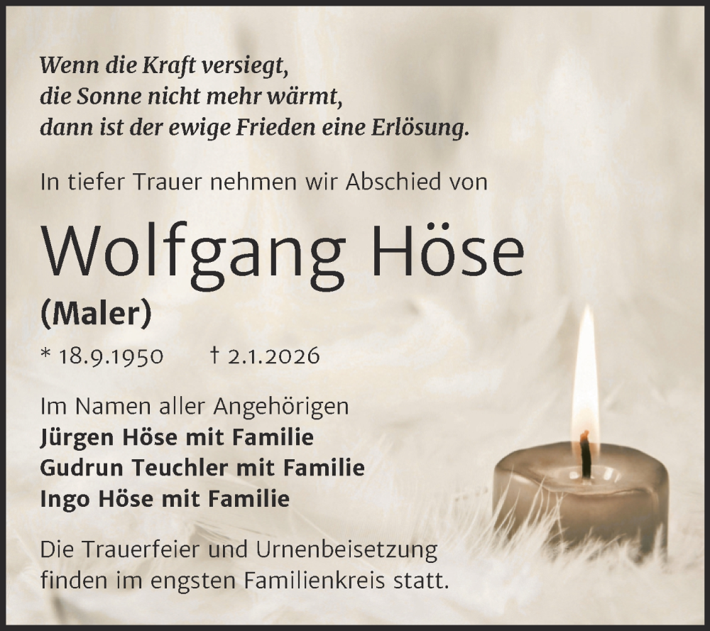 Hier finden Sie alle Traueranzeigen aus der Zeitung, die bisher für Wolfgang Höse erschienen sind. Weitere Traueranzeigen, die in der Zeitung erscheinen, werden hier ebenfalls aufgelistet