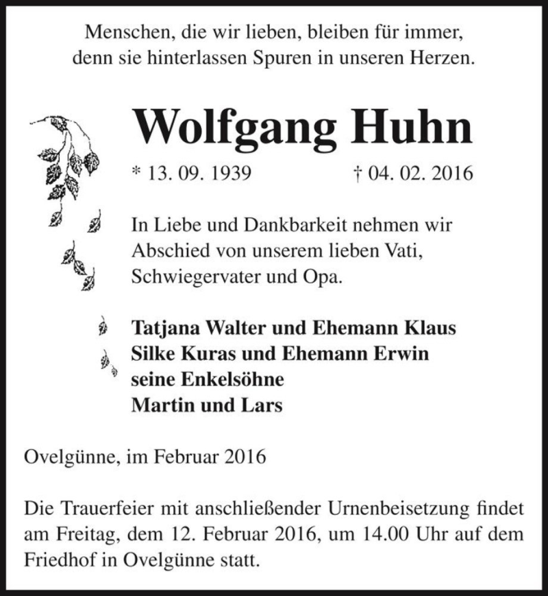 Hier finden Sie alle Traueranzeigen aus der Zeitung, die bisher für Wolfgang Huhn erschienen sind. Weitere Traueranzeigen, die in der Zeitung erscheinen, werden hier ebenfalls aufgelistet