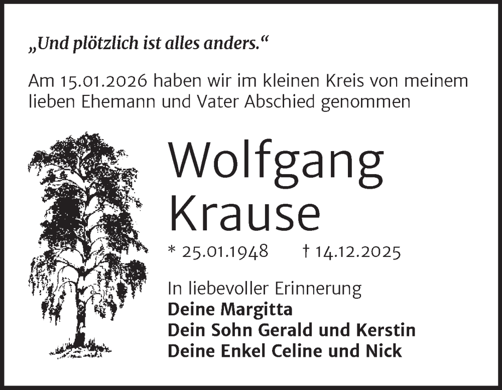 Hier finden Sie alle Traueranzeigen aus der Zeitung, die bisher für Wolfgang Krause erschienen sind. Weitere Traueranzeigen, die in der Zeitung erscheinen, werden hier ebenfalls aufgelistet