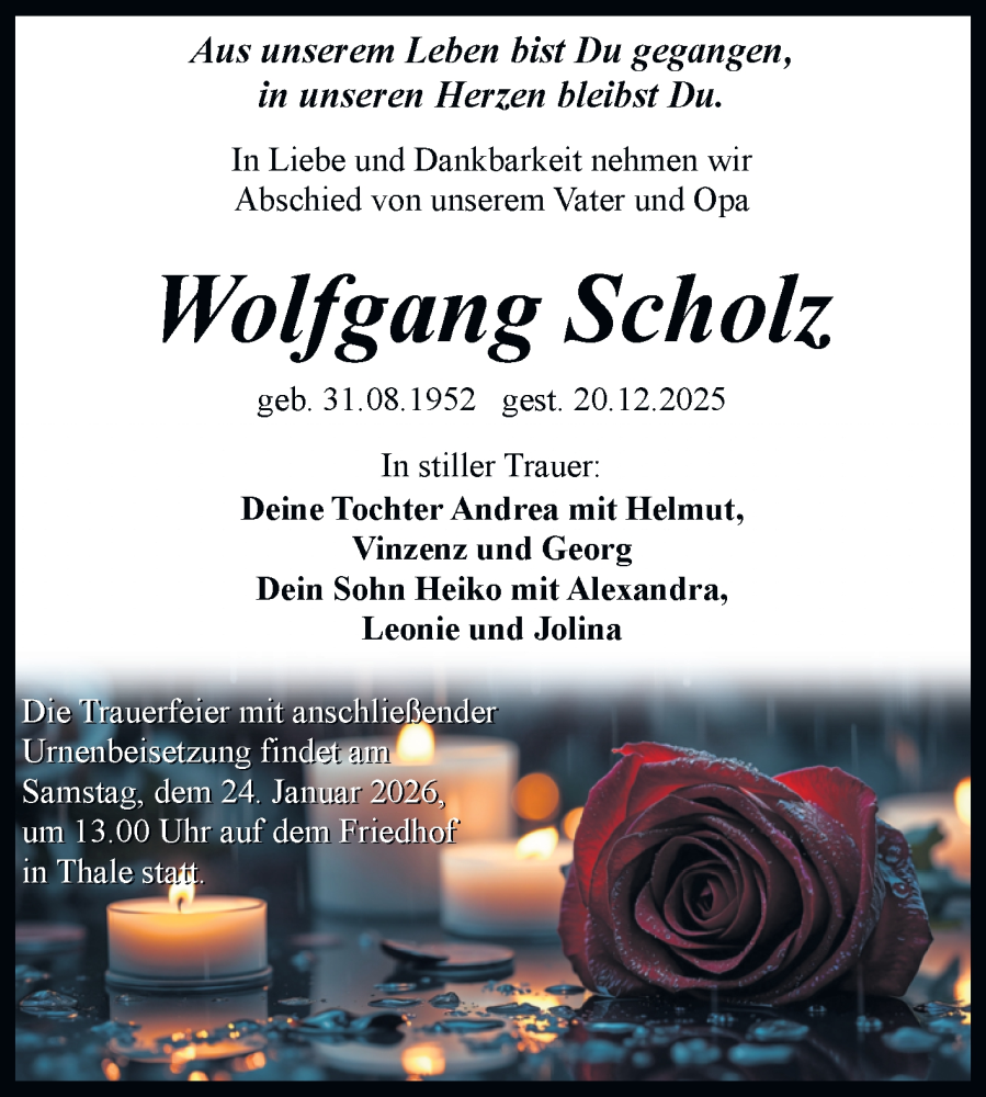 Hier finden Sie alle Traueranzeigen aus der Zeitung, die bisher für Wolfgang Scholz erschienen sind. Weitere Traueranzeigen, die in der Zeitung erscheinen, werden hier ebenfalls aufgelistet