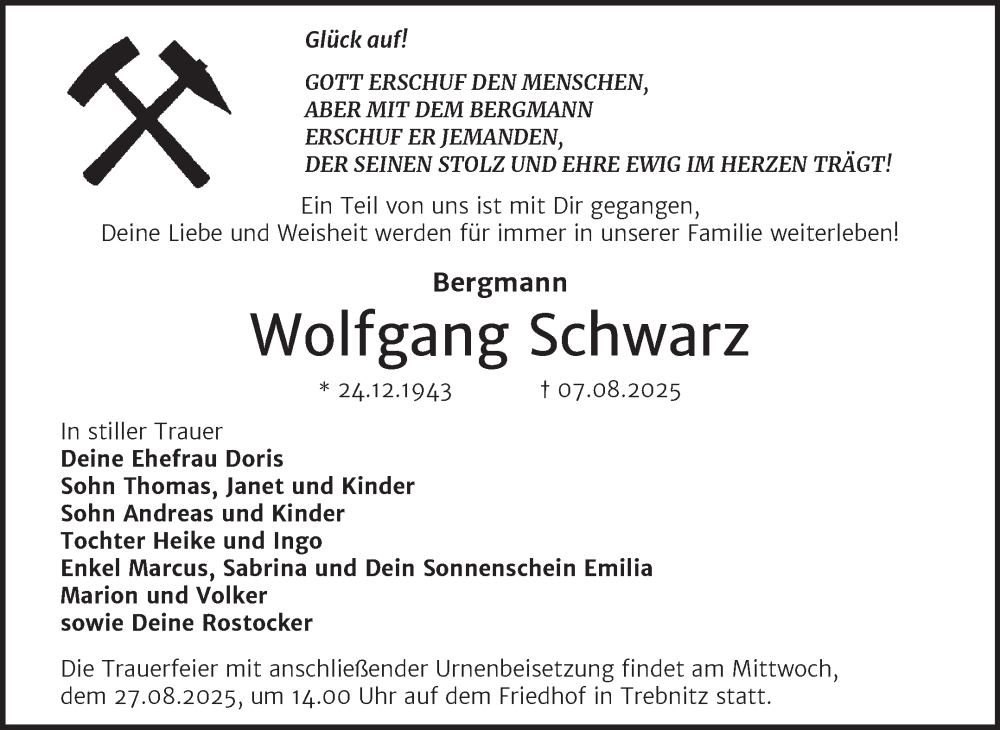 Hier finden Sie alle Traueranzeigen aus der Zeitung, die bisher für Wolfgang Schwarz erschienen sind. Weitere Traueranzeigen, die in der Zeitung erscheinen, werden hier ebenfalls aufgelistet