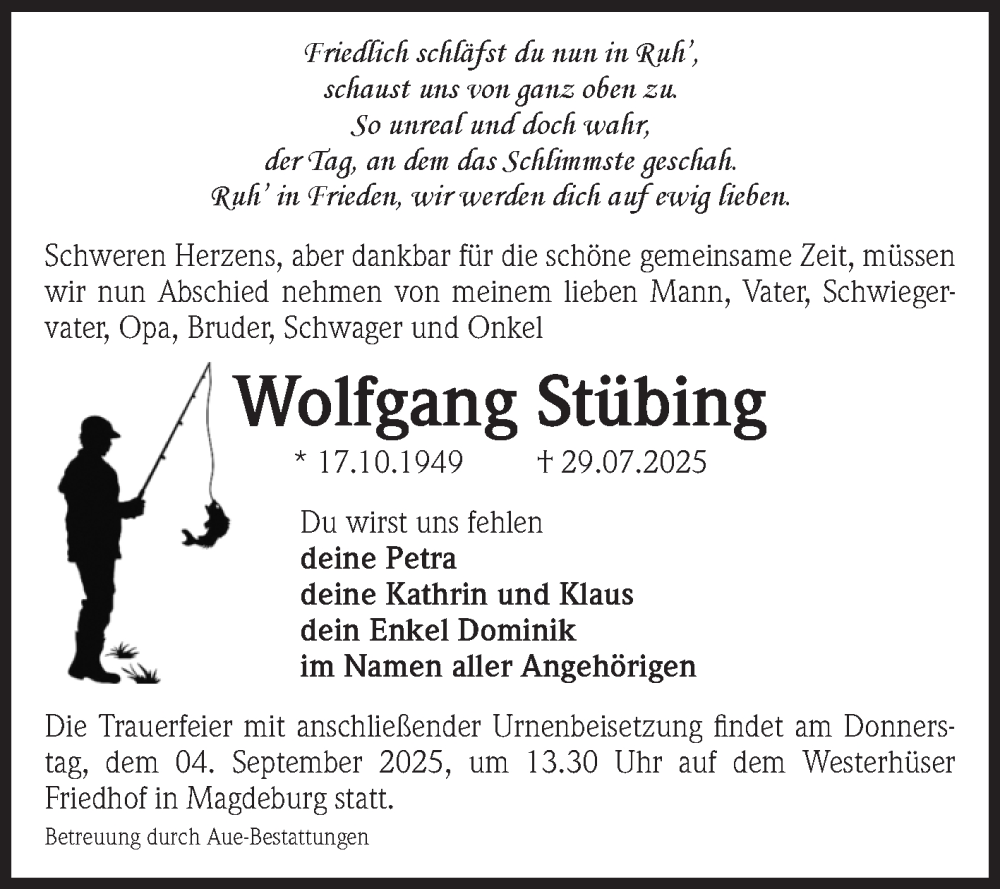 Hier finden Sie alle Traueranzeigen aus der Zeitung, die bisher für Wolfgang Stübing erschienen sind. Weitere Traueranzeigen, die in der Zeitung erscheinen, werden hier ebenfalls aufgelistet