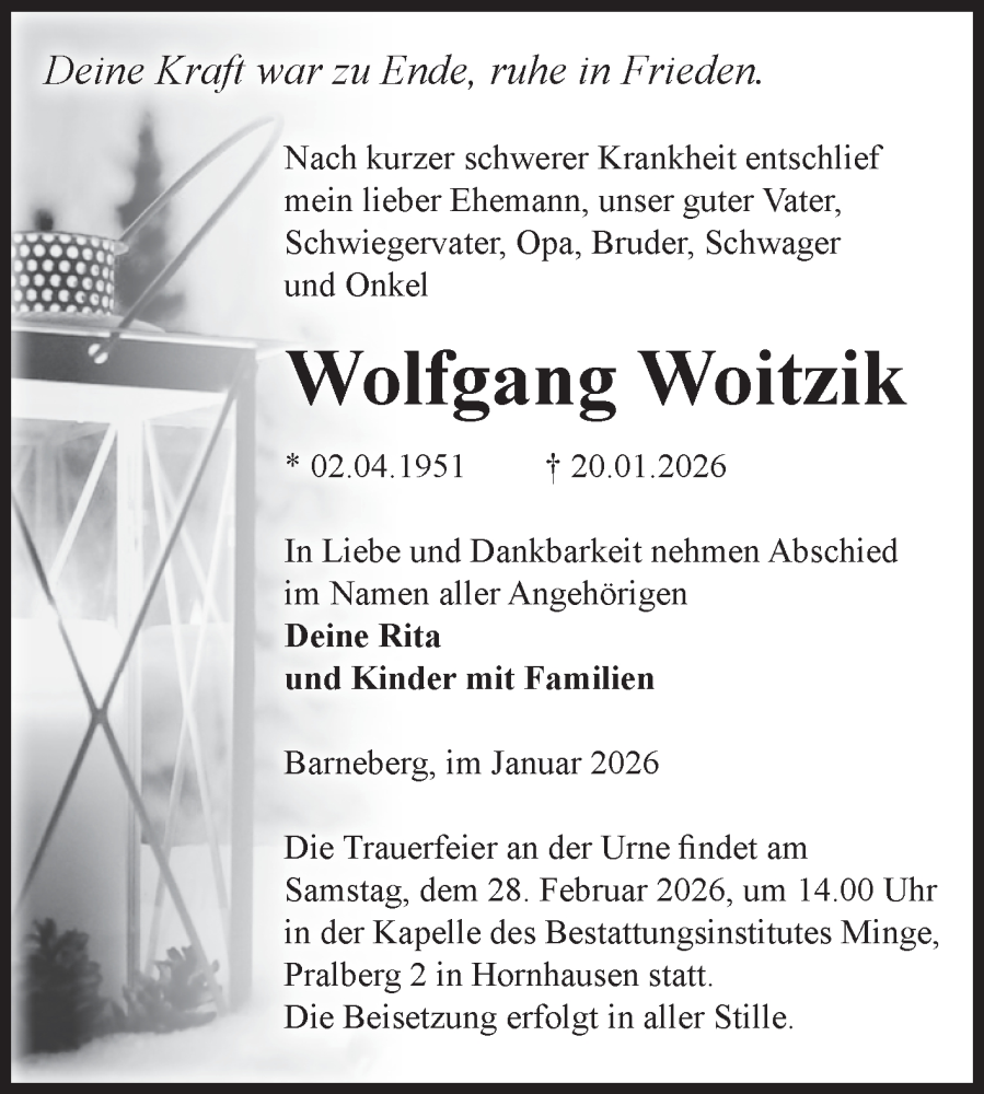 Hier finden Sie alle Traueranzeigen aus der Zeitung, die bisher für Wolfgang Woitzik erschienen sind. Weitere Traueranzeigen, die in der Zeitung erscheinen, werden hier ebenfalls aufgelistet