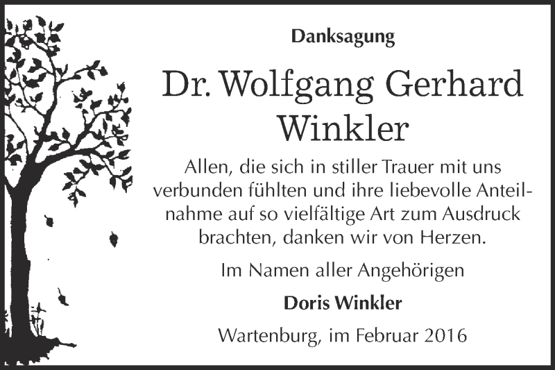 Hier finden Sie alle Traueranzeigen aus der Zeitung, die bisher für Wolfgang Gerhard Winkler erschienen sind. Weitere Traueranzeigen, die in der Zeitung erscheinen, werden hier ebenfalls aufgelistet