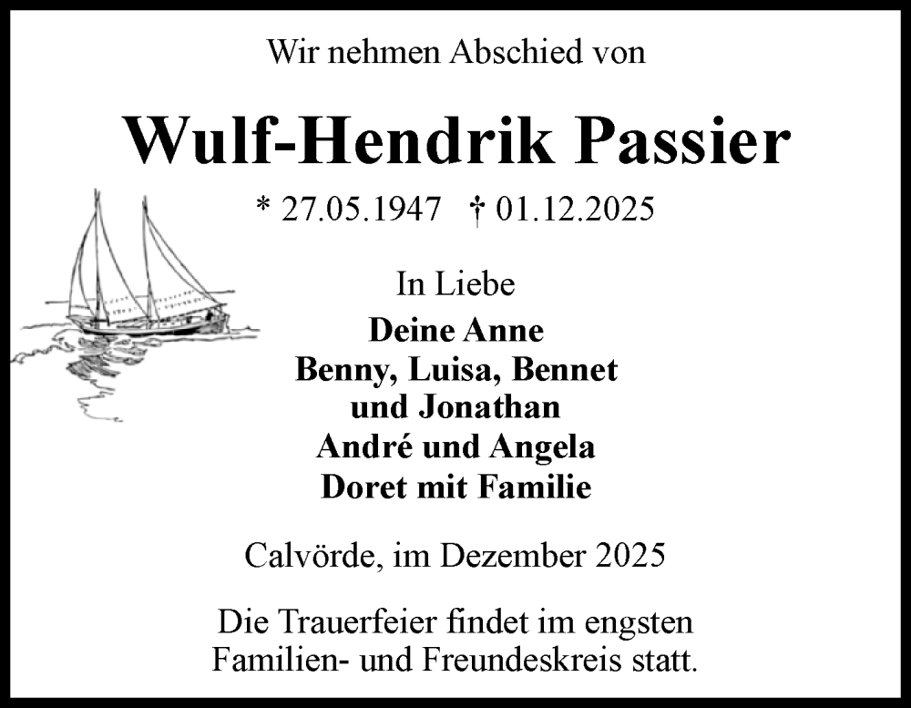 Hier finden Sie alle Traueranzeigen aus der Zeitung, die bisher für Wulf-Hendrik Passier erschienen sind. Weitere Traueranzeigen, die in der Zeitung erscheinen, werden hier ebenfalls aufgelistet