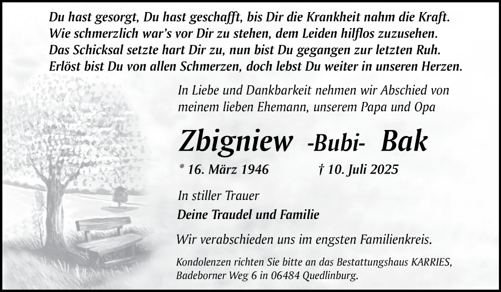 Hier finden Sie alle Traueranzeigen aus der Zeitung, die bisher für Zbigniew Bak erschienen sind. Weitere Traueranzeigen, die in der Zeitung erscheinen, werden hier ebenfalls aufgelistet